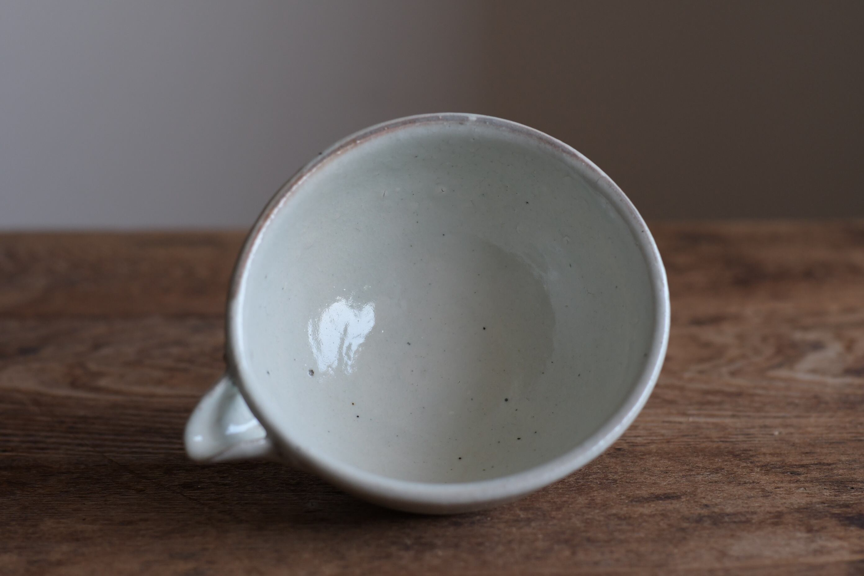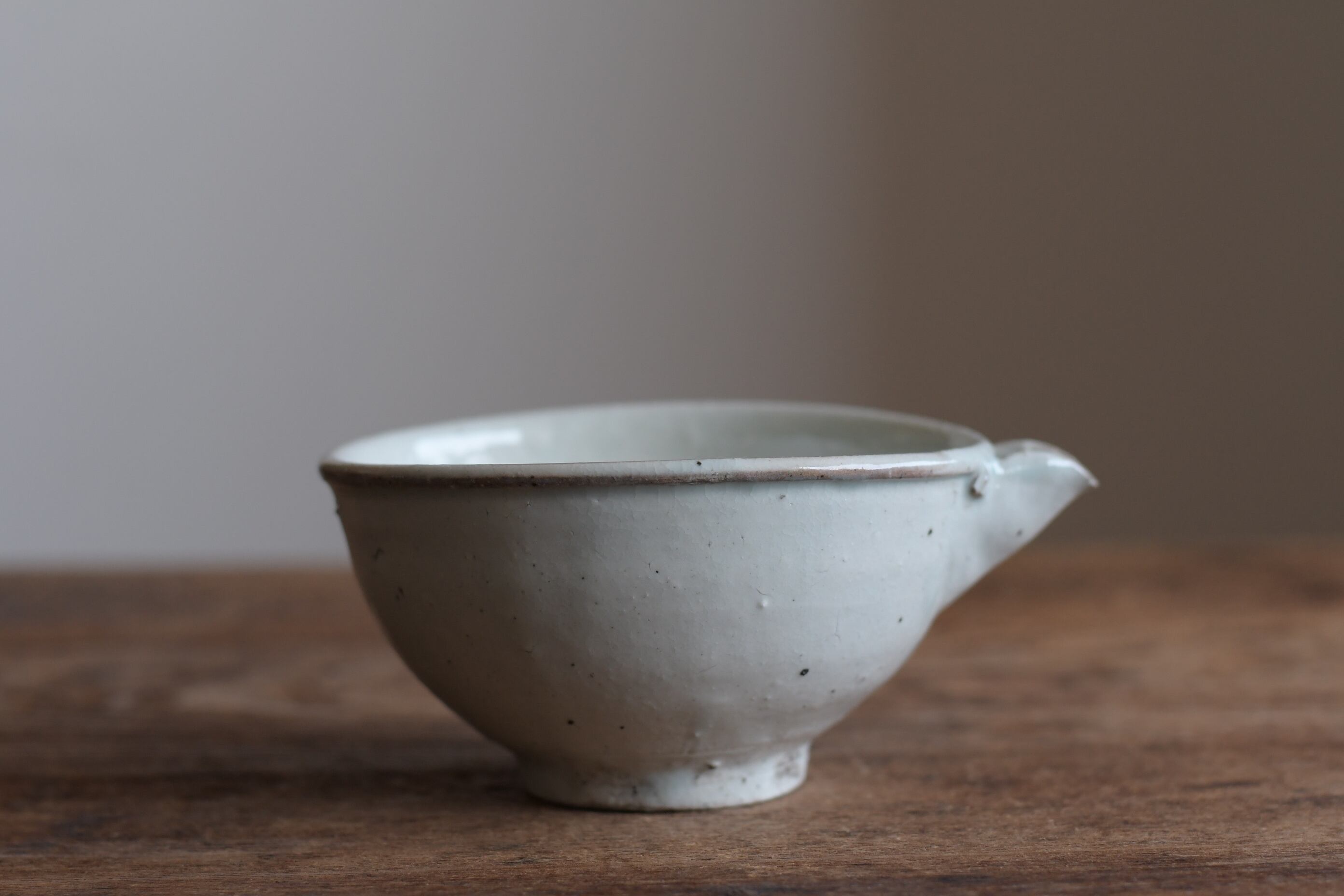 全体的に白さが際立ち、青みのある釉薬が覆い爽やかな印象の片口です。